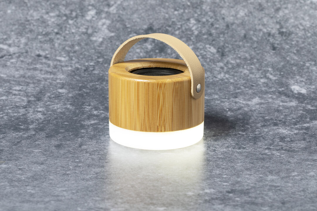 Info: Altoparlante Bluetooth® compatto con potenza di 3W e luce LED. Realizzato in bambù e ABS, con tracolla in similpelle. Batteria al litio da 300 mAh, con cavo di ricarica di tipo C incluso. Presentato in una scatola kraft individuale, con manuale di istruzioni in inglese e spagnolo.