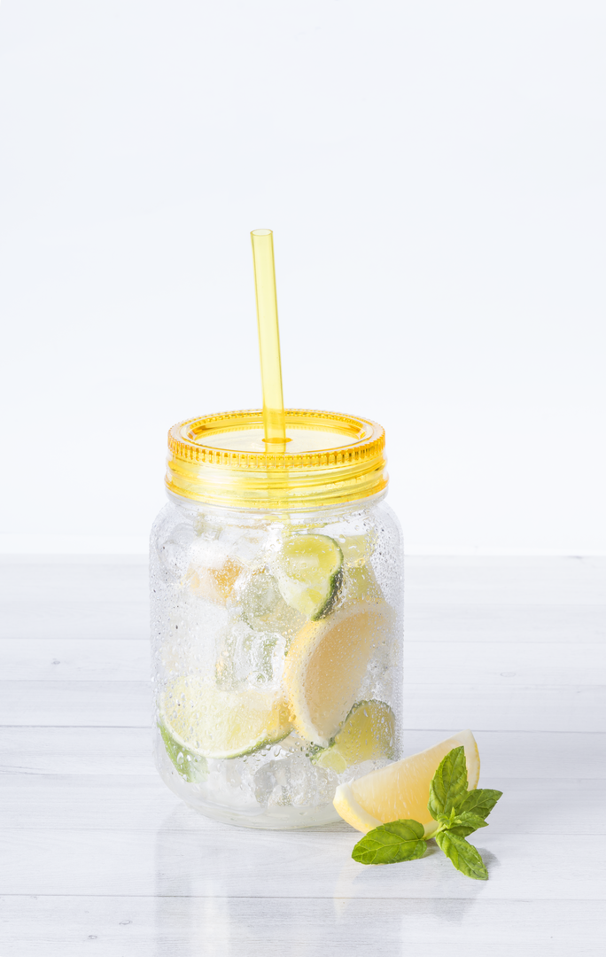 Info: Divertente barattolo in PS della capacità di 600 ml con corpo trasparente e accessori in una gamma di colori vivaci. Con coperchio a vite e cannuccia abbinata.