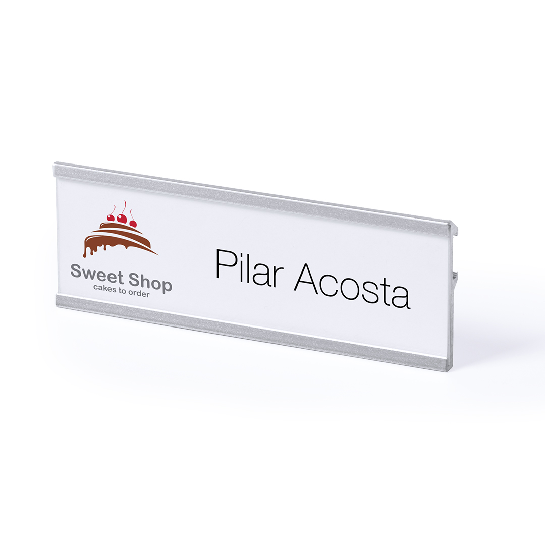 Info: Badge portanome con cornice in alluminio con finitura anodizzata. Lato posteriore con chiusura a spillo per un fissaggio sicuro.