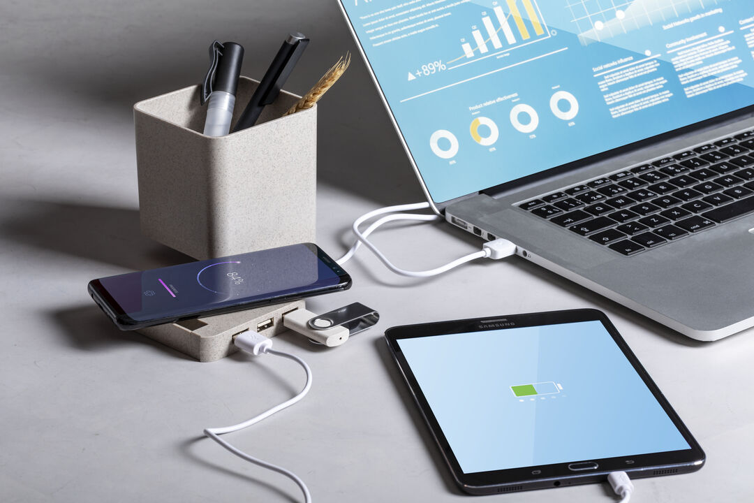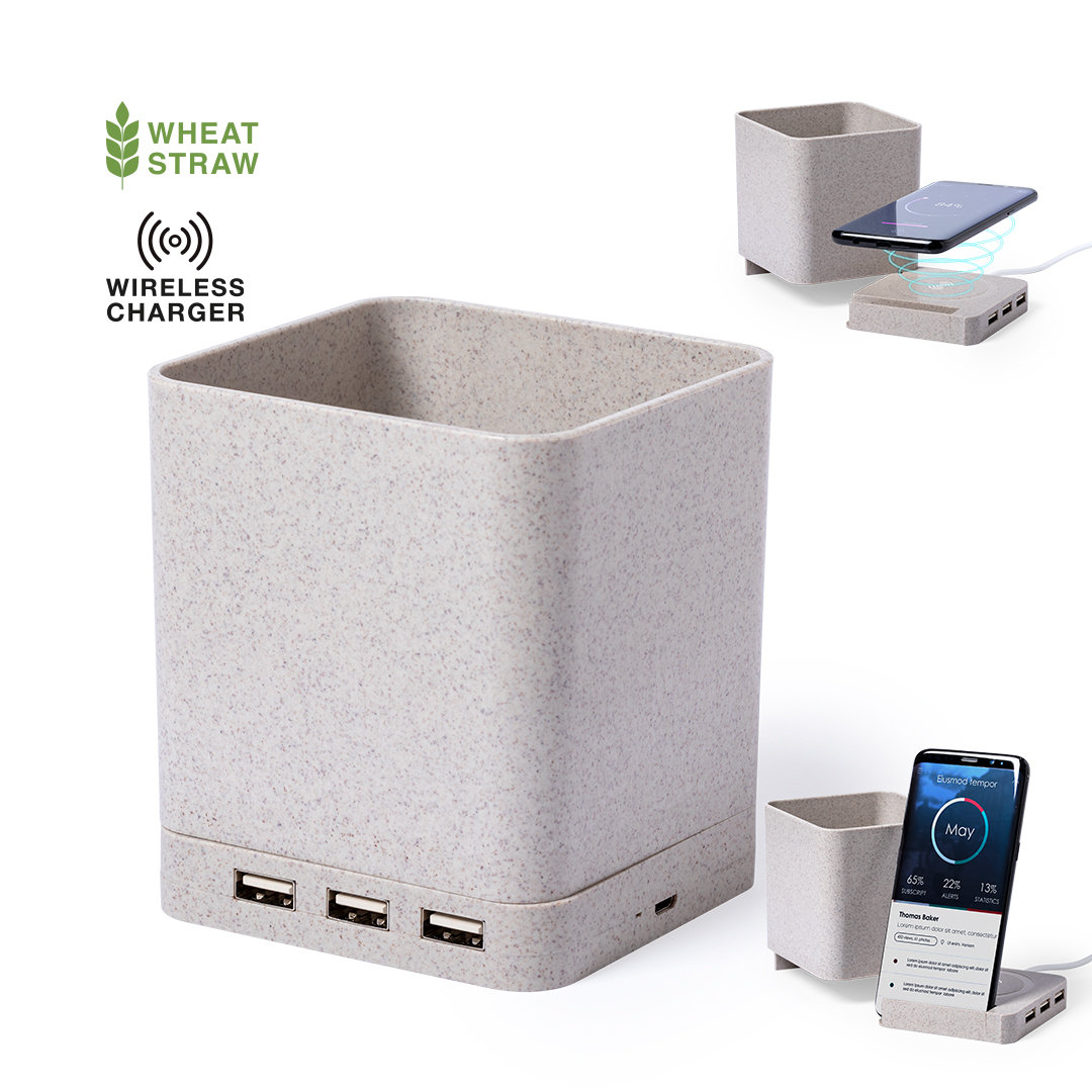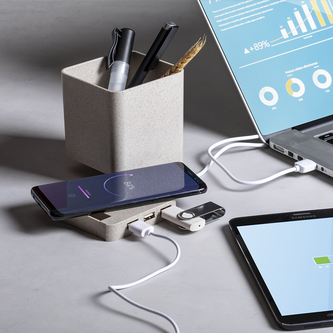 Info: Matita multifunzionale 4 in 1 linea Nature. Custodia in canna di grano, per favorire l'utilizzo di materie prime naturali e ridurre le emissioni inquinanti.Con funzioni penna, supporto per smartphone, caricatore wireless e porta USB (3xUSB 2.0). Compatibile con smartphone con tecnologia di ricarica wireless, include un cavo micro USB bianco lungo 1 metro. Presentato in un'attraente scatola dal design ecologico. Manuale di istruzioni disponibile in spagnolo e inglese