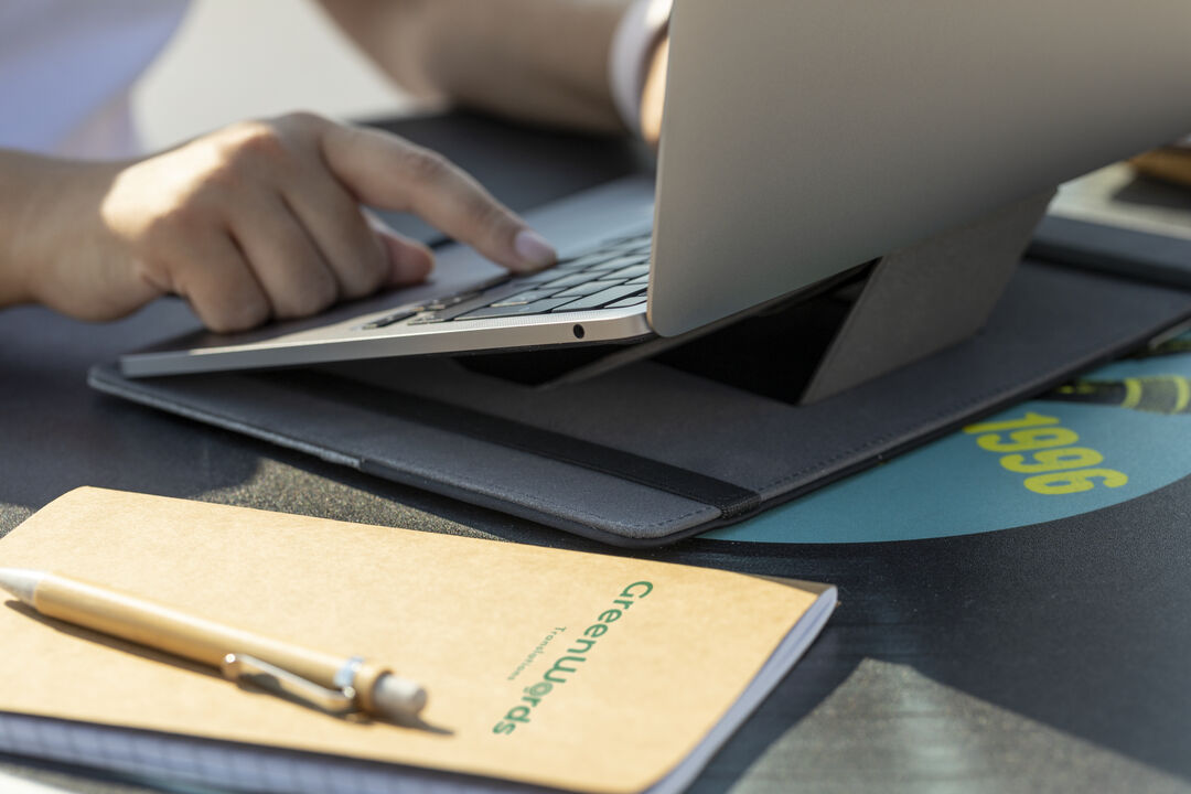Info: Elegante e pratico organizer con supporto magnetizzato, ideale per facilitare il lavoro o l'uso del computer portatile in qualsiasi luogo o spazio. Realizzato in resistente poliestere grigio marmorizzato con dettagli in similpelle nera. Include portapenne e porta smartphone, con 4 tasche elastiche per riporre vari gadget.