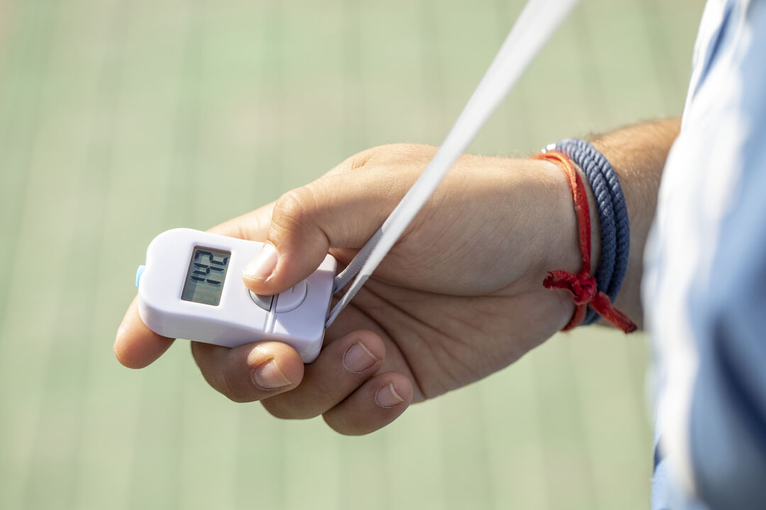 Contatore digitale di capacità realizzato in resistente materiale ABS con finitura lucida, con pratico nastro in poliestere e grandi pulsanti per aggiungere o sottrarre capacità .
