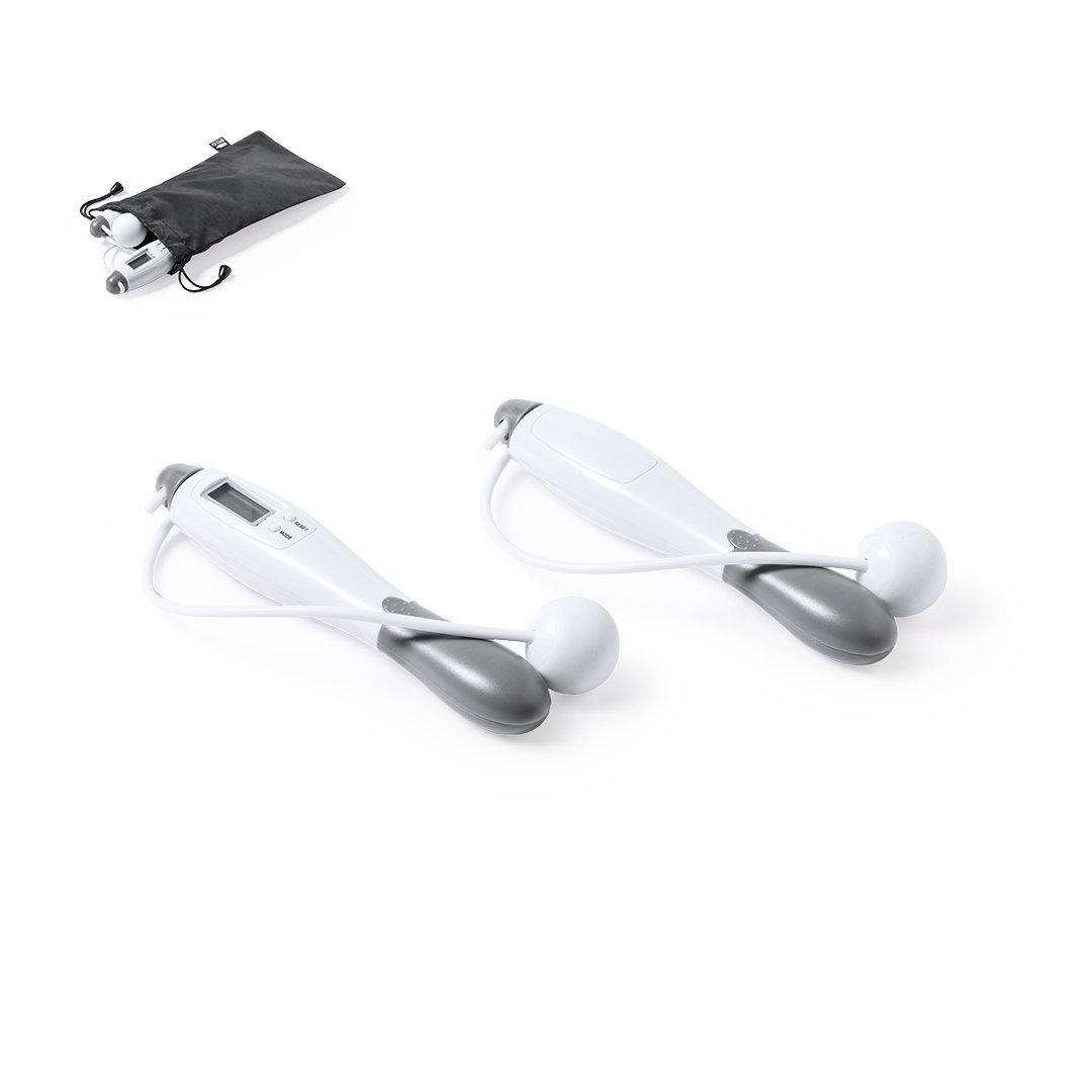 Info: Corda da salto digitale, realizzata in ABS resistente. Con impugnature ergonomiche e display LCD con pulsanti di regolazione. Presentata in una custodia in poliestere RPET con chiusura a coulisse, realizzata in plastica riciclata per promuovere il riutilizzo dei rifiuti plastici e contribuire alla sostenibilità del pianeta. Etichetta distintiva RPET sulla custodia. Alimentazione a batteria (batterie a bottone incluse).