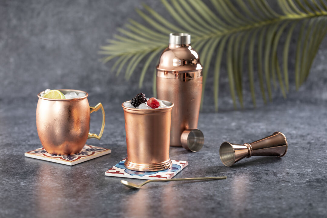 Info: Misurini per bevande in acciaio inox con rivestimento esterno in rame galvanizzato. 2 misure: singolo da 25 ml e doppio da 50 ml. Presentato in unattraente scatola dal design individuale.