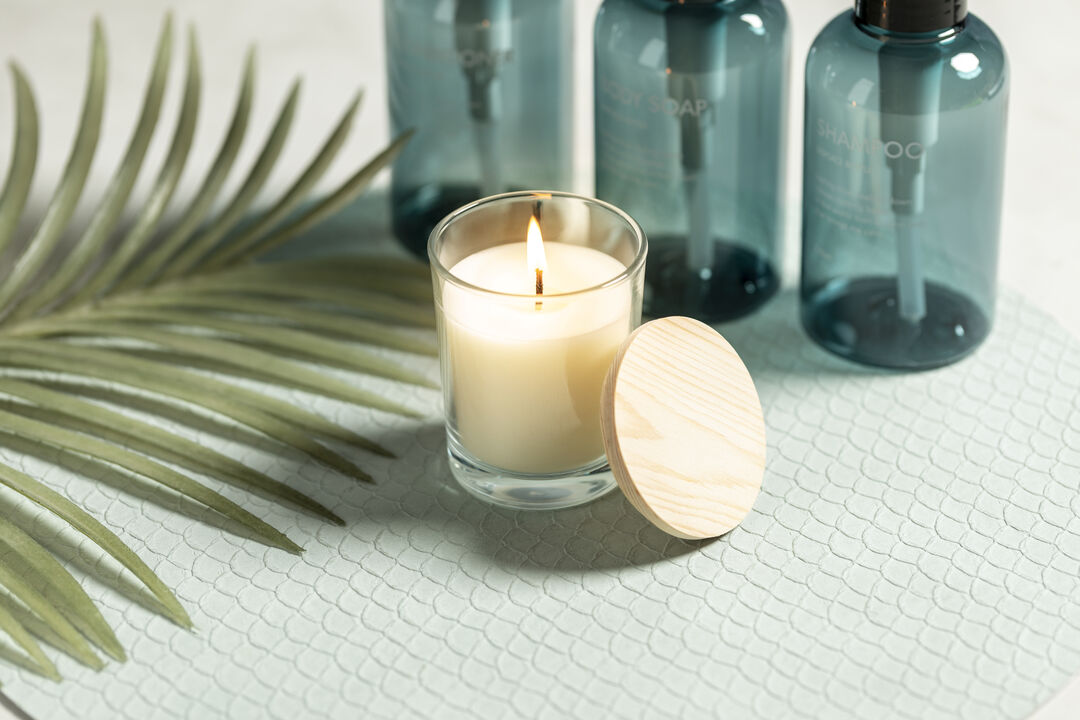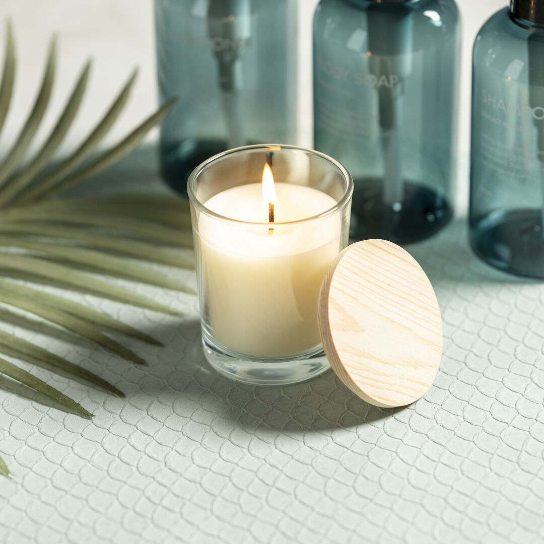 Info: Candela profumata in vaso di vetro, con coperchio in legno naturale e profumo di vaniglia. Logo Made In Europe.