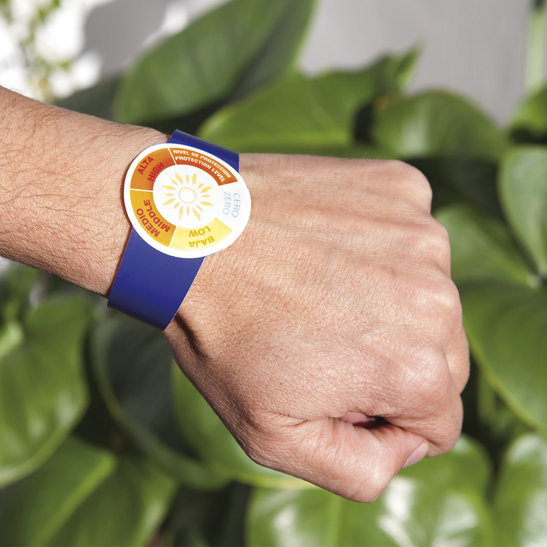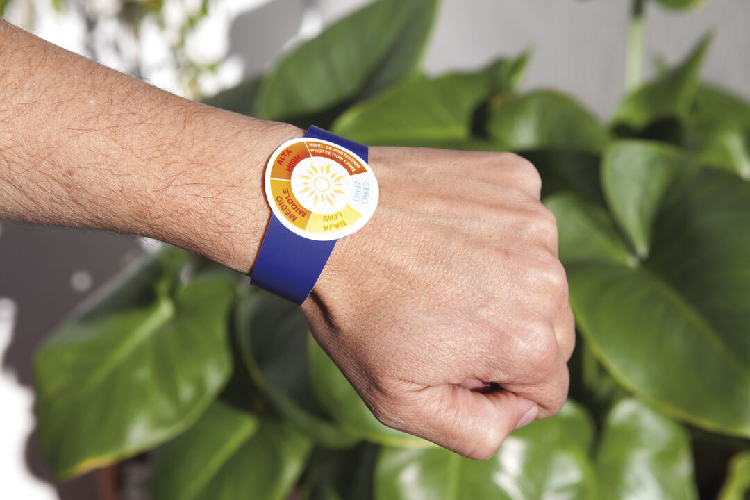 Info: Bracciale regolabile con misuratore di radiazioni UV in diversi colori vivaci. Con chiusura a strappo.