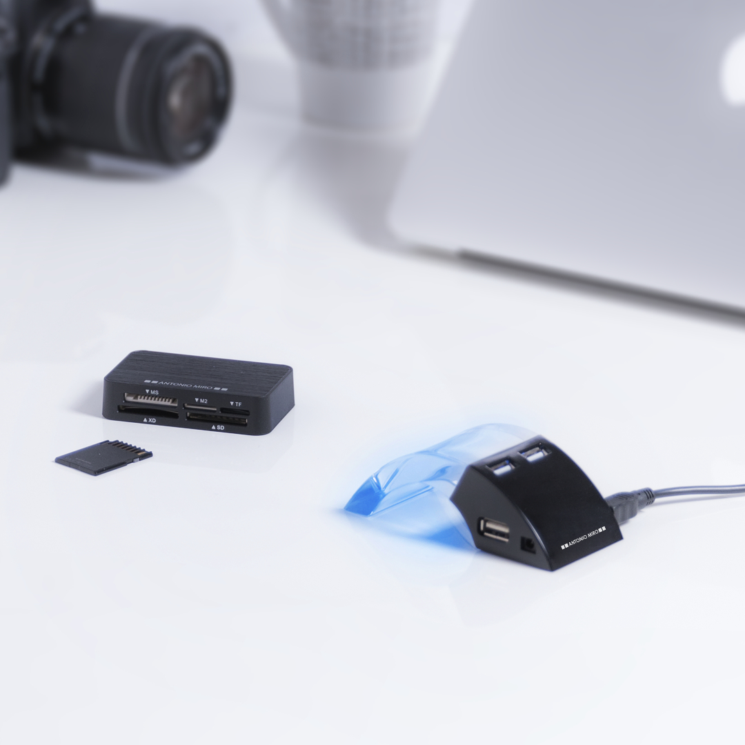 Info: Lettore di schede di Antonio MirĂ³ con elegante parte superiore in alluminio nero. Compatibile con schede MS, M2, TF, XD, SD e CF. Presentato in una scatola individuale con il logo del marchio con interno in morbida schiuma.