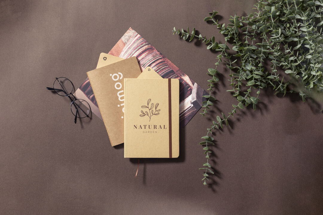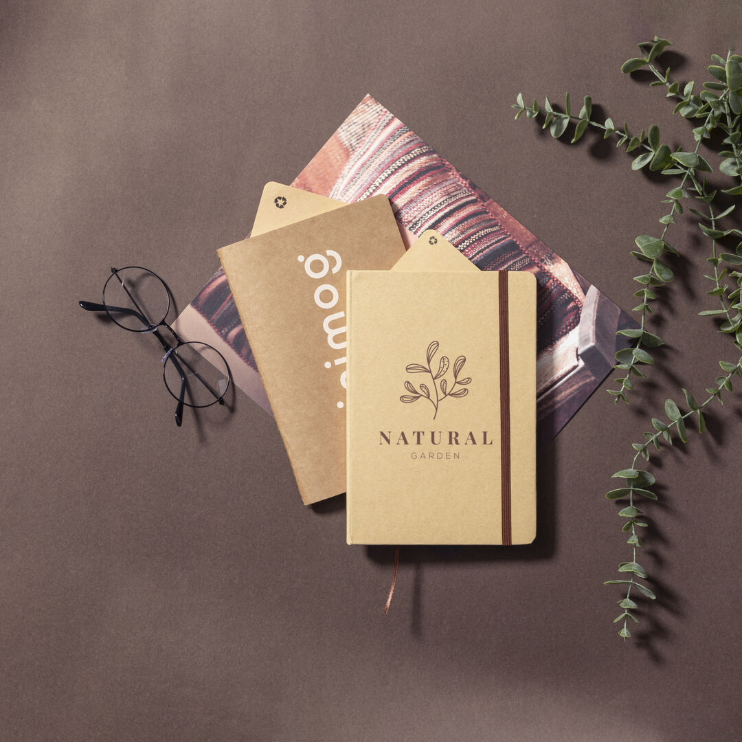 Info: Block Note - formato A5 - della linea natura con copertina rigida in robusto cartone riciclato. 100 fogli lisci con rifinitura kraft, etichetta riciclata, con rilegatura elastica e segnalibro in tessuto abbinato.