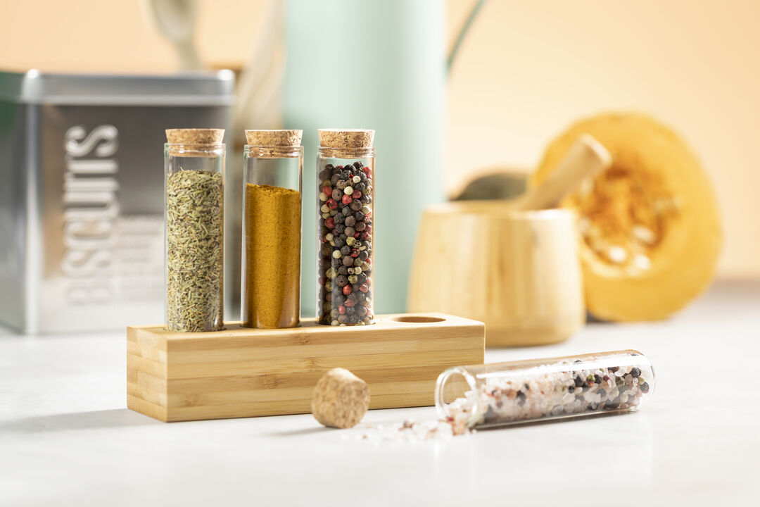 Info: Set spezie della linea natura. Include 4 vasetti da 70ml in vetro borosilicato, che offre una resistenza e una durata eccezionali, estendendo la sua vita utile e può essere riutilizzato innumerevoli volte. Tappi in sughero naturale e supporto in bambù, per promuovere l'uso di materie prime naturali. Confezionato in una scatola individuale con finitura kraft.