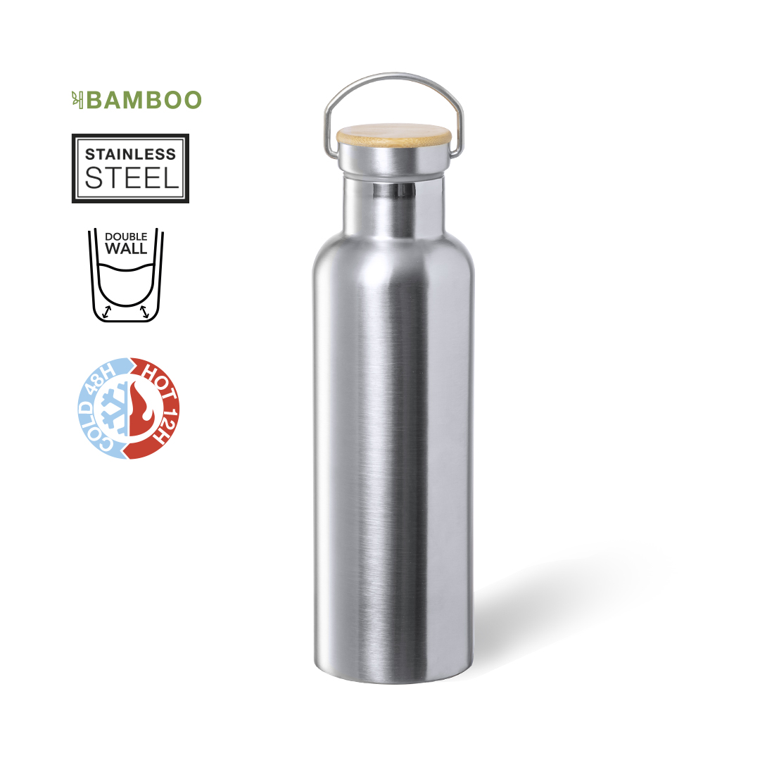 Info: Borraccia thermos da 750 ml, in acciaio inox a doppia parete con finitura opaca. Include il tappo a vite originale in acciaio inossidabile con dettagli in bambù e manico integrato. Priva di BPA e presentata in una scatola individuale dal design kraft.