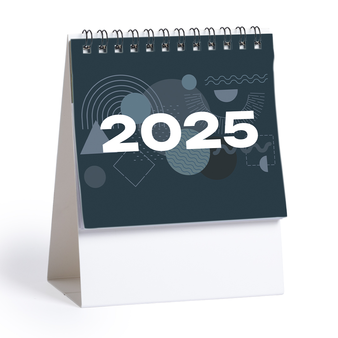 Info: Calendario da tavolo ad anelli, di formato triangolare, in cartone. Design mese in corso/mese precedente/mese successivo e calendario dei giorni santi. Ampia superficie per la stampa su entrambi i lati.