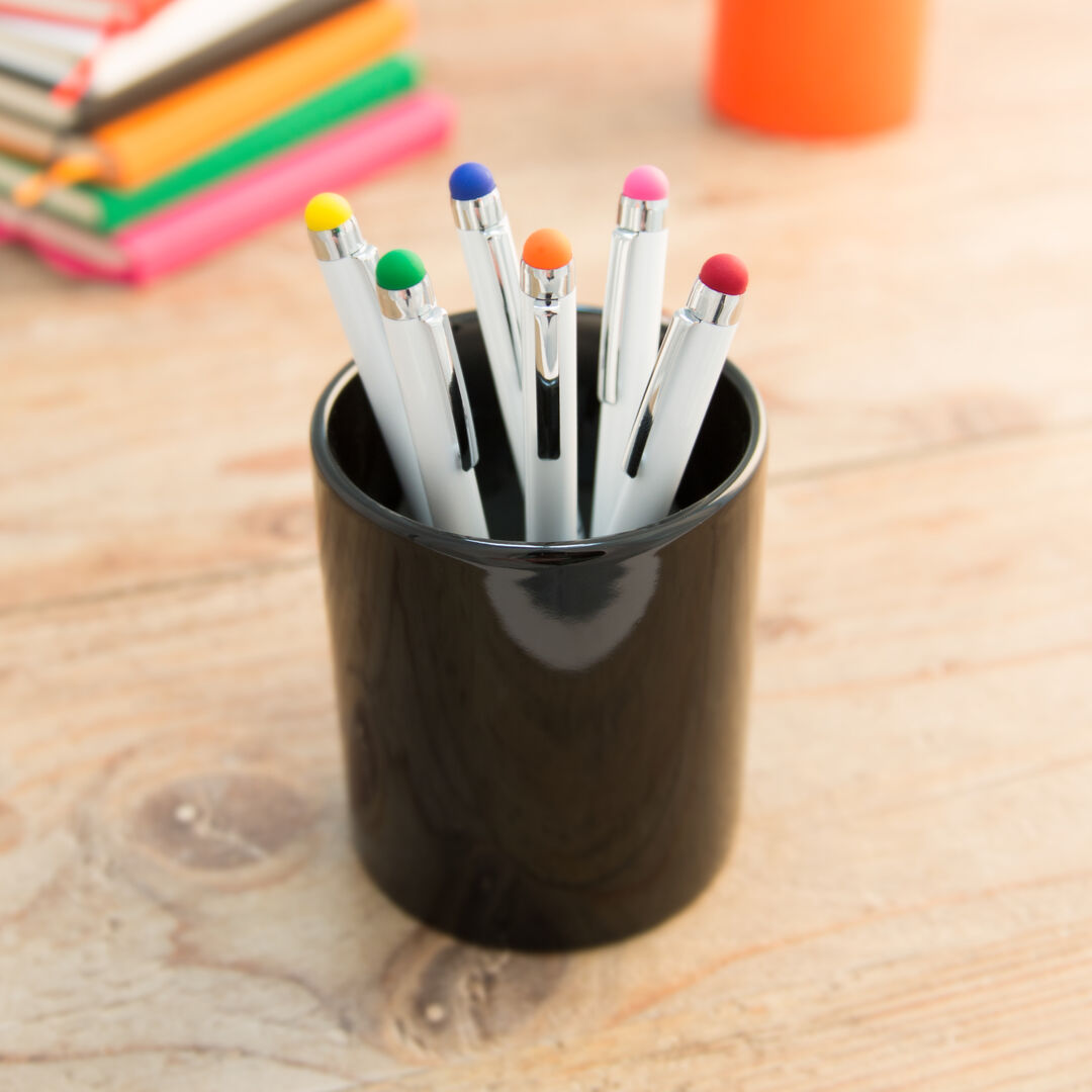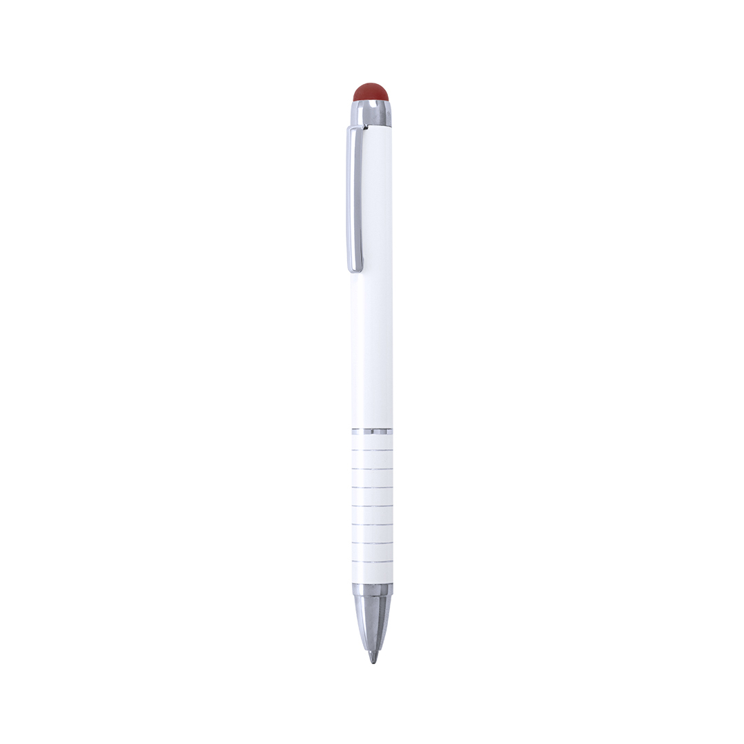 Info: Penna touch con meccanismo girevole e fusto in alluminio liscio con finitura metallica, in elegante colore bianco. Raccordi e anelli color argento. Touch in vari colori, impugnatura originale ad anelli e inchiostro blu.