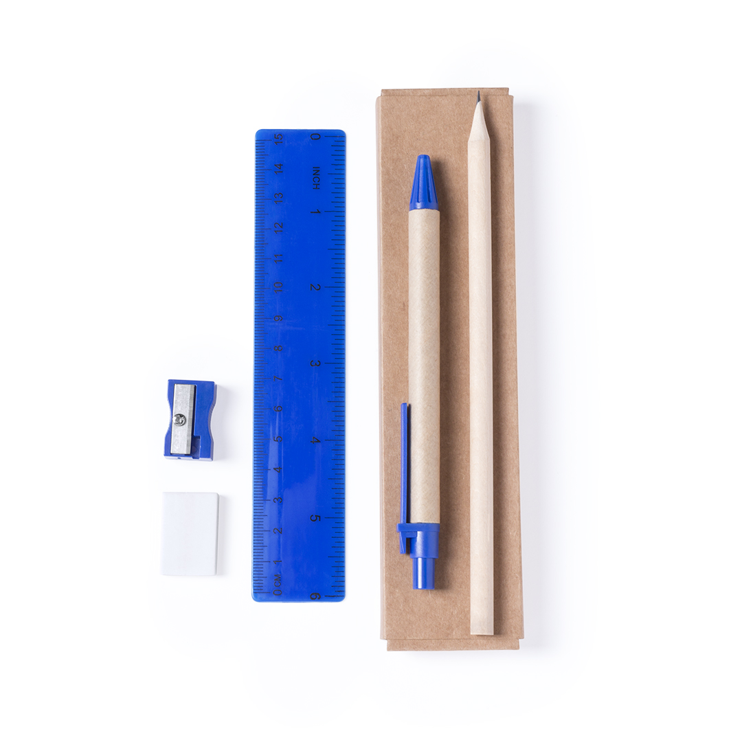 Info: Set da 5 pezzi in una varietà di colori vivaci presentati in una scatola di cartone naturale. Include penna con meccanismo a pulsante e inchiostro blu in cartone riciclato, matita cilindrica in legno, temperamatite, gomma e righello da 15 cm.