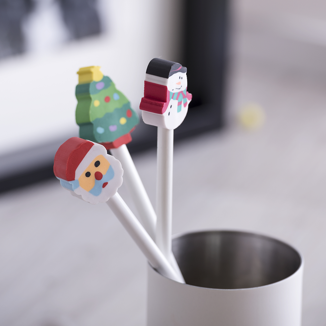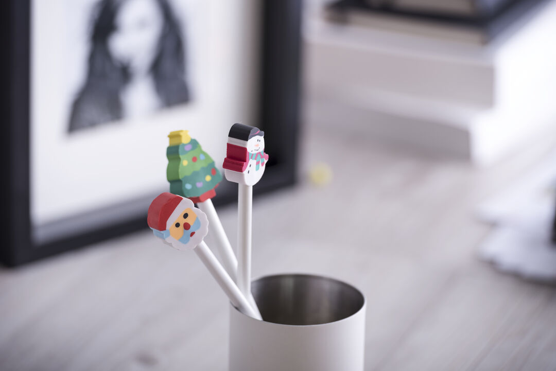 Info: Matita in legno con disegno natalizio, in colore bianco e finitura lucida. corpo rotondo e disponibile in più soggetti natalizi. Mina nera e punta non affilata.