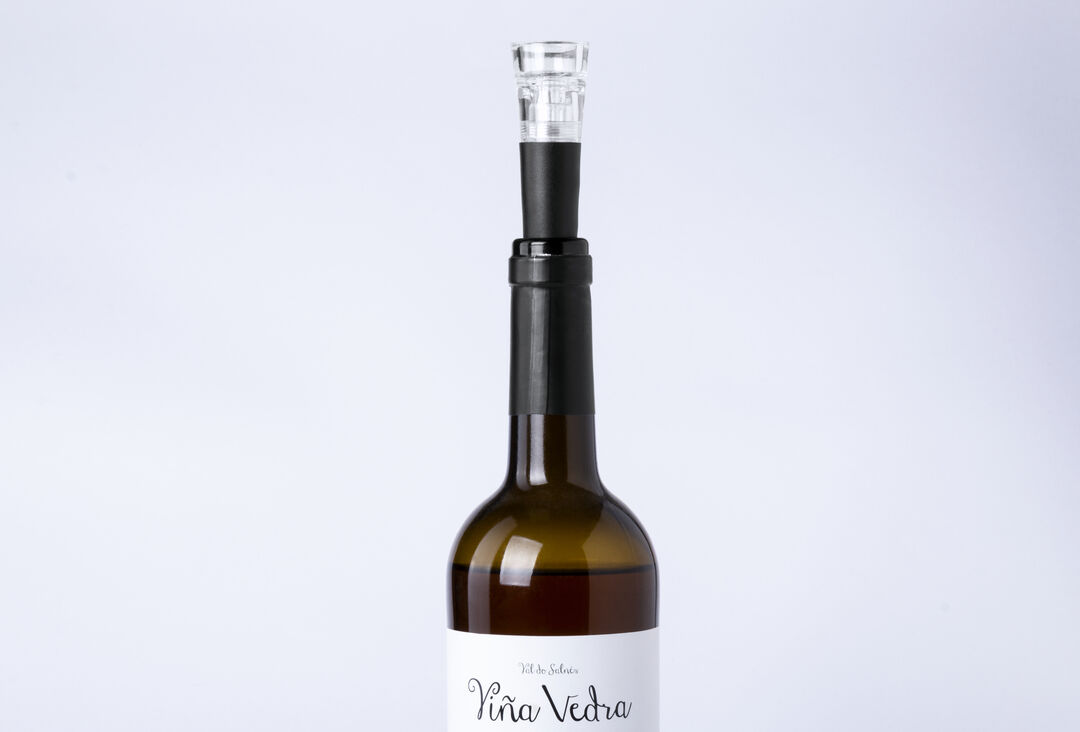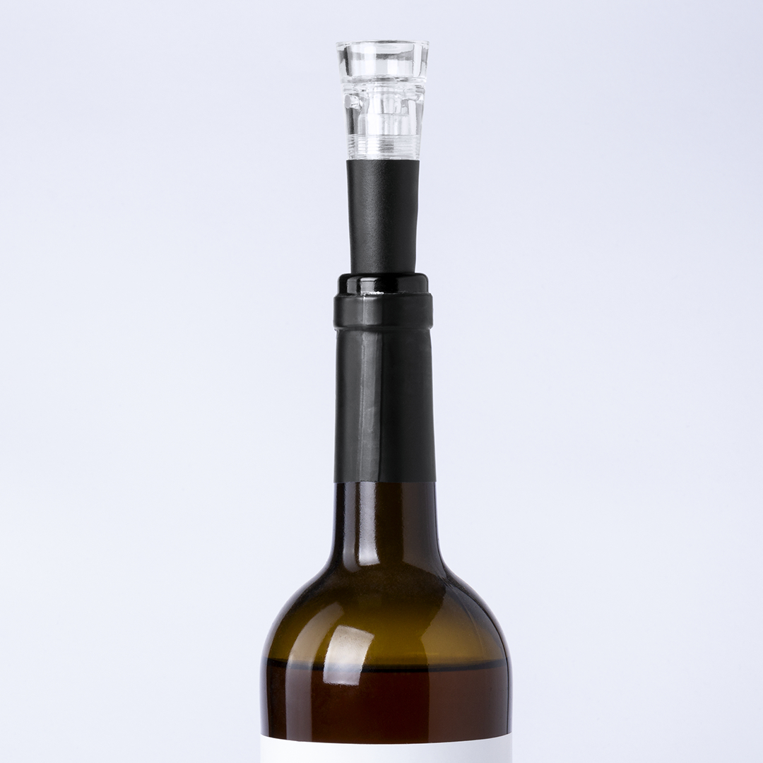 Info: Tappo a pompa per vuoto per bottiglie di vino in elegante design nero e trasparente. Parte superiore del tappo in metallo per stampa laser o tampografica. Presentato in scatola individuale.