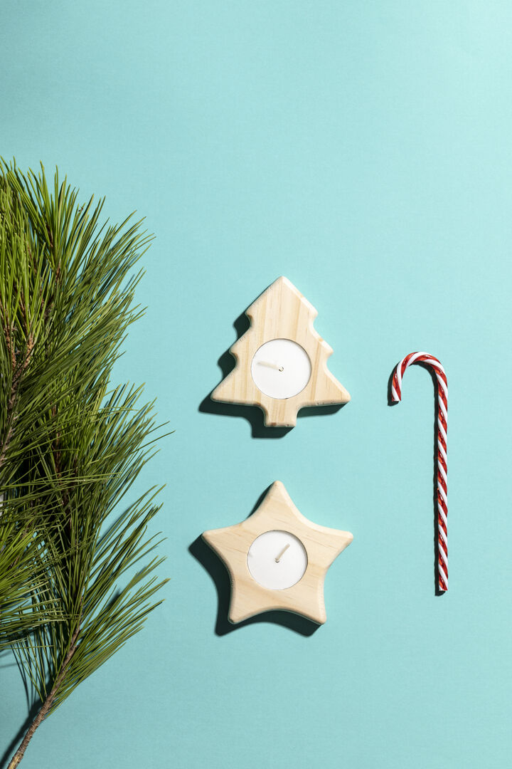 Info: Candela natalizia in legno di pino con originali disegni di stelle e alberi. Presentata singolarmente in una scatola bianca.