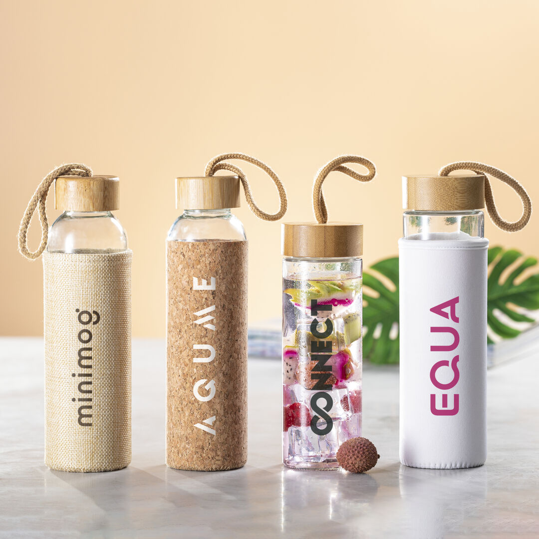 Info: Borraccia della linea natura da 500 ml. Realizzato con fusto in vetro e tappo a vite in bambù, con una pratica maniglia per il trasporto in corda intrecciata di colore naturale. Include una cover di sughero naturale. Confezionato singolarmente in una scatola dall'attraente design ecologico.