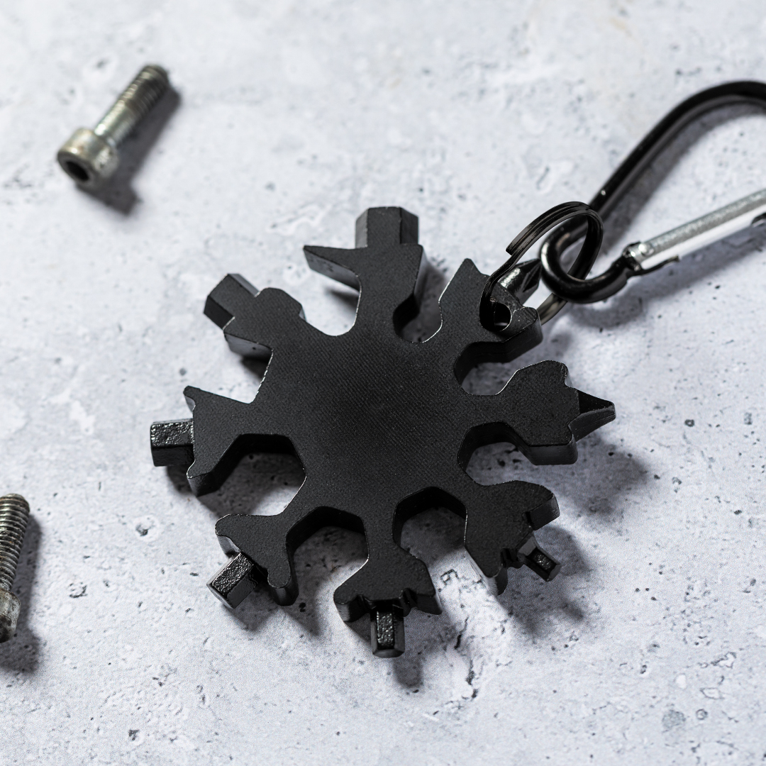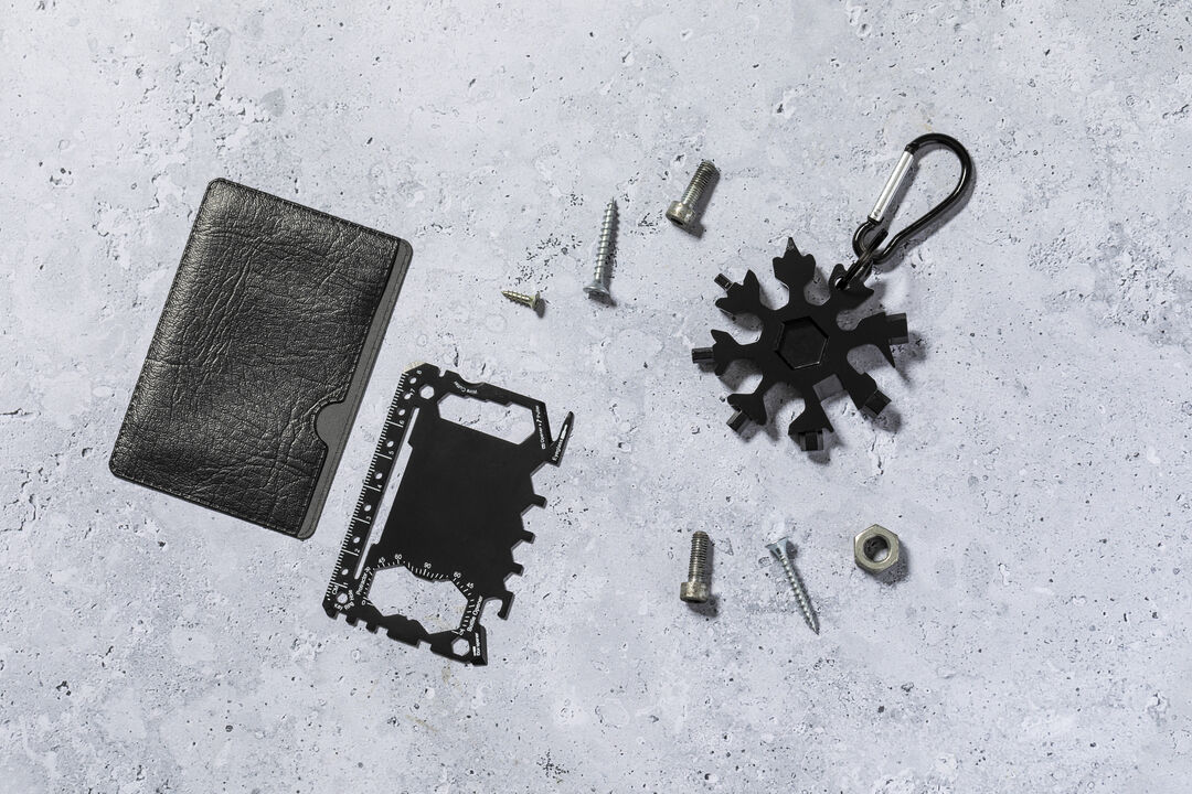 Info: Originale e pratico multiutensile in robusto acciaio inox con finitura nera, con anello di trasporto e moschettone abbinati. Con 17 funzioni, tra cui cacciavite piatto e a croce chiavi esagonali a brugola coltello e apribottiglie. Confezionato singolarmente in una scatola nera.