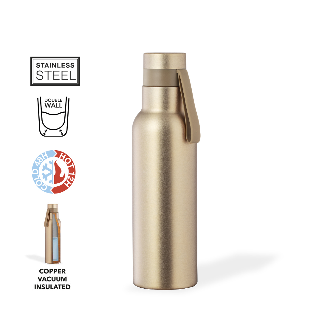 Info: Borraccia termica da 530 ml, in acciaio inox a doppia parete. Con isolamento sottovuoto in rame, che consente di mantenere il caldo e il freddo più a lungo, rispettivamente fino a 12 e 48 ore. Tappo a vite con manico integrato, senza BPA. Disponibile in una gamma di colori metallizzati e presentata in una scatola kraft individuale.