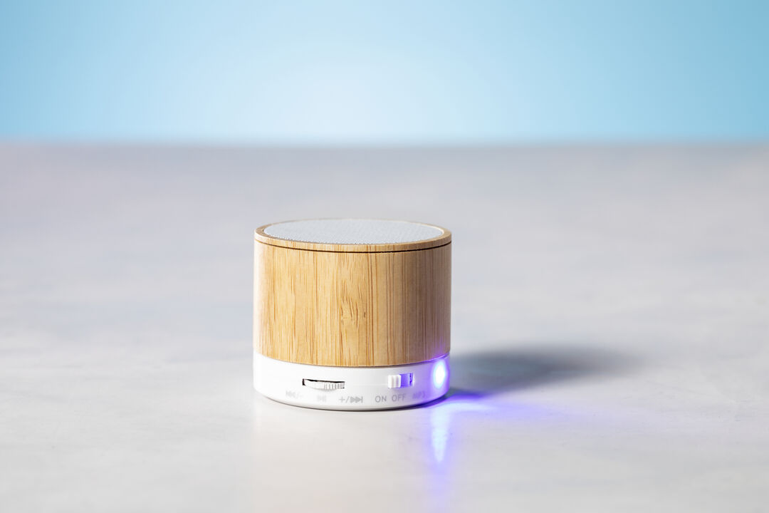 Info: Altoparlante compatto con corpo in bambù e connessione Bluetooth®. Griglia in metallo, con potenza di 3W, funzione vivavoce, uno slot per schede mini SD, funzione radio FM e base antiscivolo. Ricaricabile tramite cavo USB -incluso- e presentato in una scatola dal design accattivante.