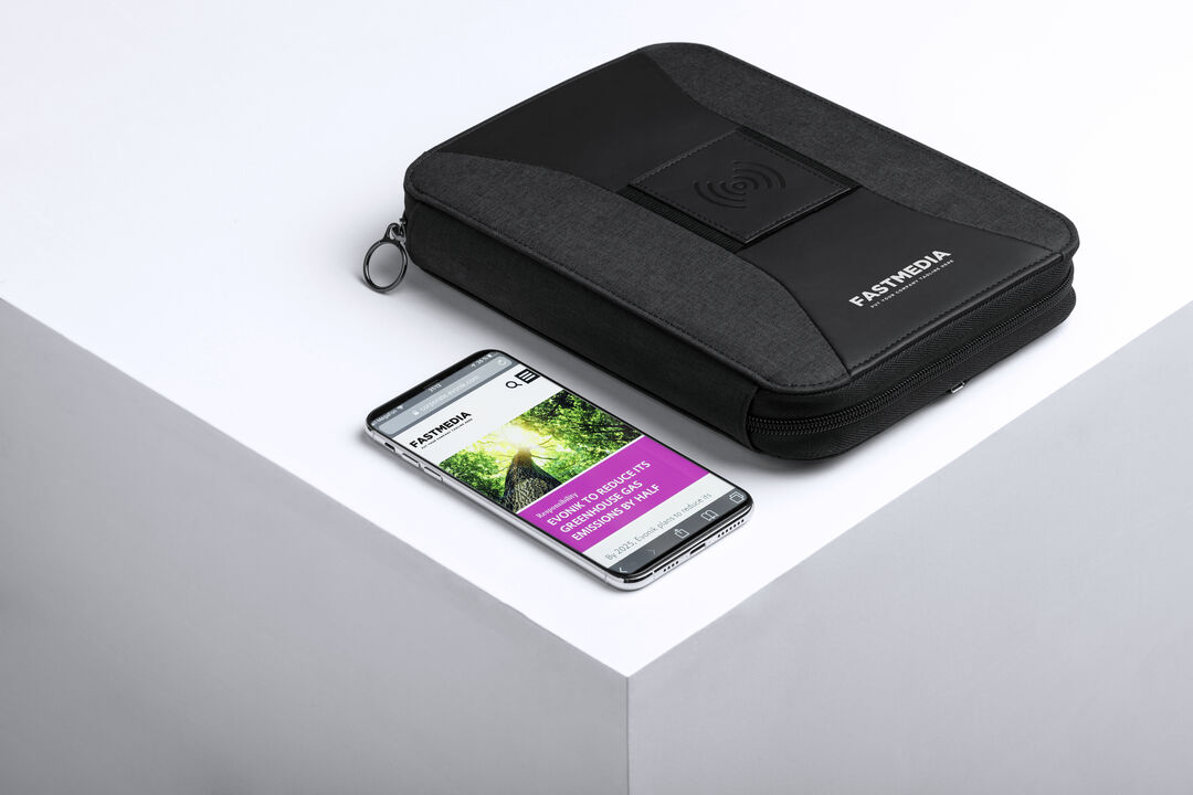 Info: Portaoggetti completo per power bank, in una combinazione di materiali in poliestere 300D e PU. Caricatore wireless integrato nel coperchio, con supporto per smartphone. Include una batteria ausiliaria da 4.000 mAh con capacità di ricarica integrata. Dal design sobrio e con chiusura a zip, include un block notes da 64 fogli con layout a righe singole, un portapenne e un portacarte. Uscita USB, con cavo micro USB incluso e presentato in un'elegante scatola nera. Le capacità indicate su tutti i nostri power bank sono reali; tutti incorporano batterie di grado A, non riciclate, con una durata di almeno 500 cicli di carica e conformi alla normativa CE. Inoltre, sono prodotti secondo gli standard RoHS e in conformità con i seguenti requisiti di sicurezza: Sistema di protezione da sovraccarico del power bank. Sistema di protezione dalla scarica completa per una maggiore durata del power bank. Sistema di blocco per prevenire i cortocircuiti.