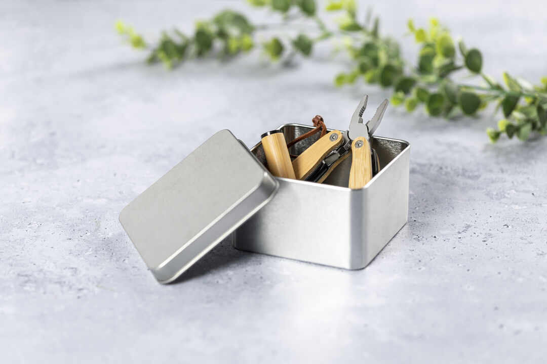 Info: Scatola di presentazione quadrata, in robusto metallo argentato, con coperchio coordinato.