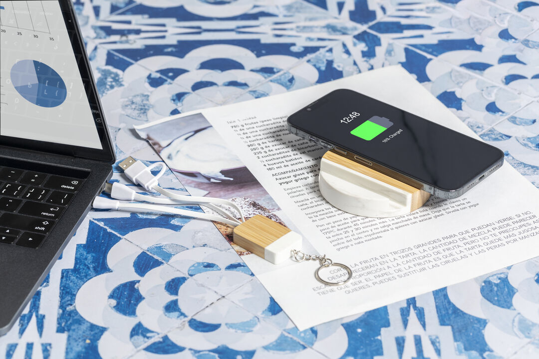 Info: Caricatore wireless da 15 W con supporto per smartphone integrato. Dal design circolare e realizzato con materiali naturali: base in bambù, con supporto in estratto di marmo. Compatibile con i dispositivi dotati di tecnologia di ricarica wireless Qi. Include un cavo di ricarica di tipo C e un manuale di istruzioni in inglese e spagnolo. Confezionato in una scatola kraft individuale di design.Prodotto secondo gli standard RoHS e in conformità ai seguenti requisiti di sicurezza:Sistema di protezione dal surriscaldamento.Sistema di protezione da sovraccarico.Sistema di bloccaggio per evitare cortocircuiti.