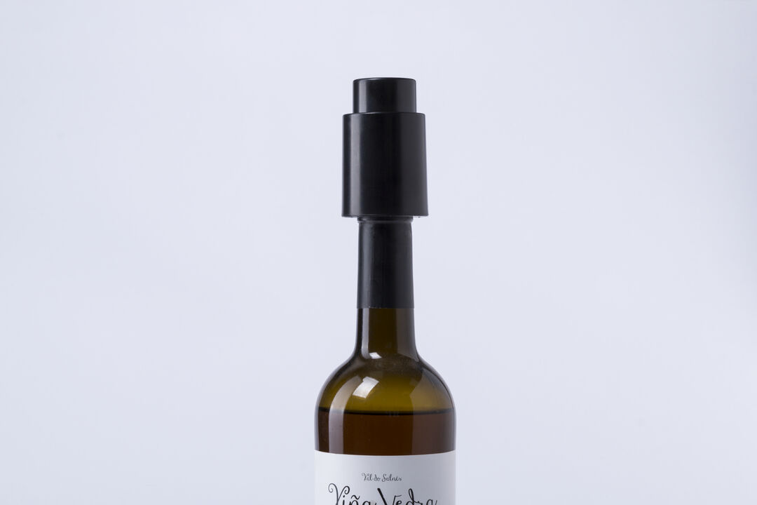 Info: Tappo a pompa per vuoto per bottiglie di vino dall'elegante design nero. Parte superiore del tappo per la tampografia. Presentato in scatola individuale.