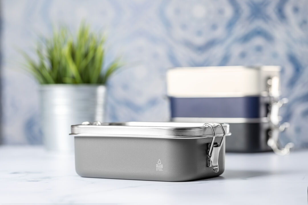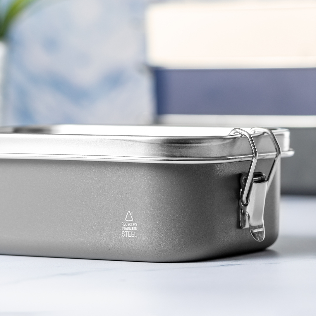 Portapranzo con capacità di 750 ml, realizzato in acciaio inox riciclato.