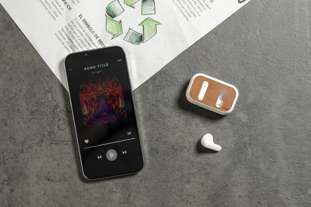 Cuffie in-ear Bluetooth®, realizzate in RABS in un elegante colore bianco, con il coperchio della base di ricarica rivestito in pelle riciclata.Connessione Bluetooth® 5.1, funzione vivavoce e batteria da 30 mAh.