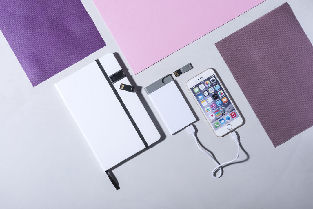 Elegante block notes bianco con chiavetta USB da 16 GB integrata nella copertina.