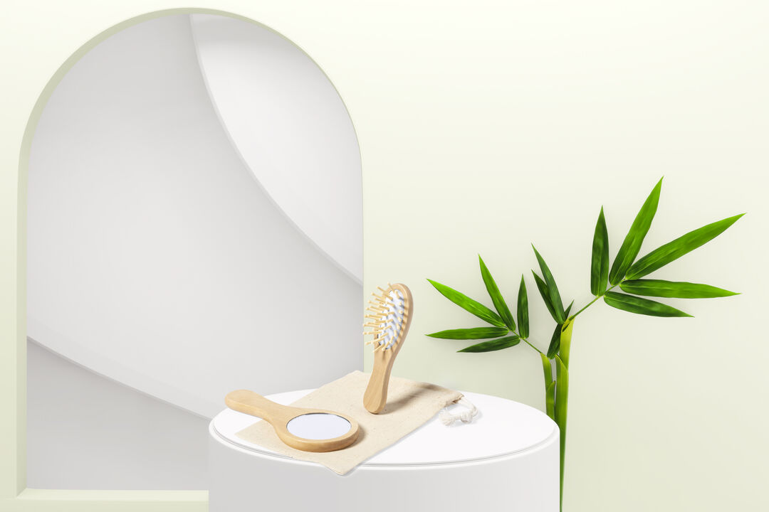 Set di specchio e spazzola, in legno naturale.