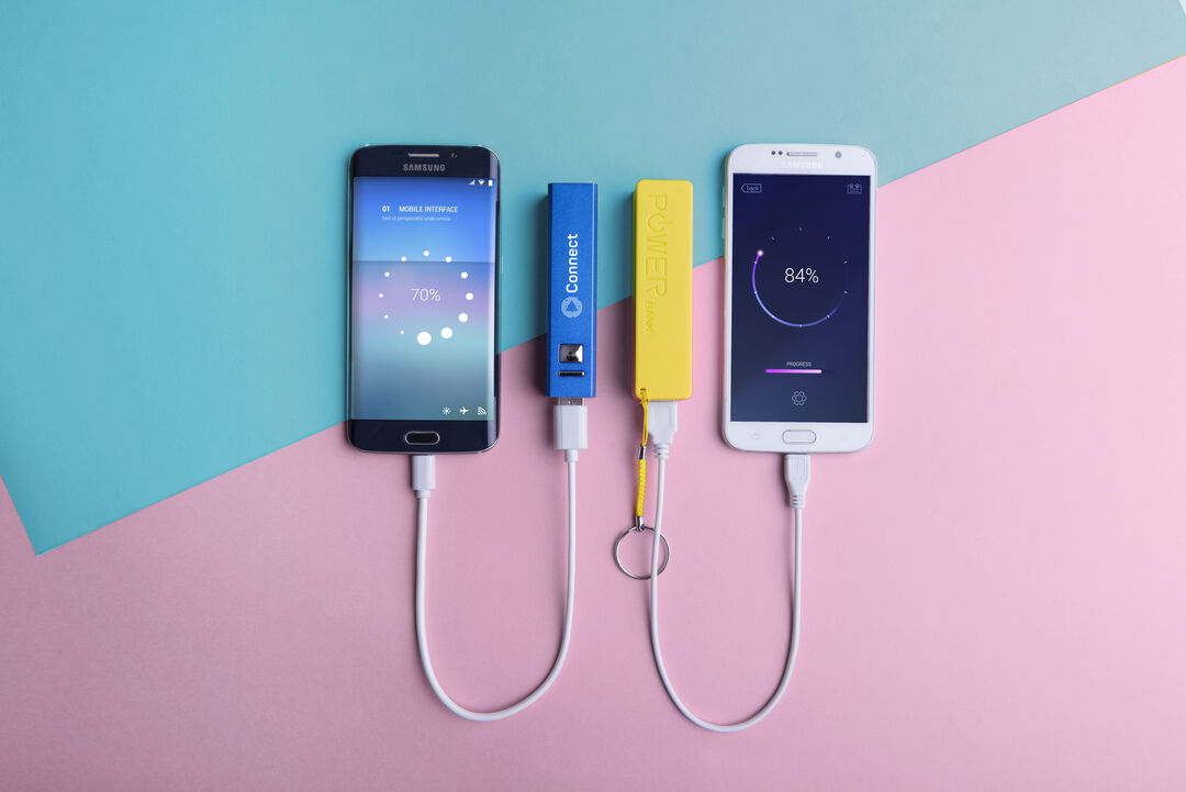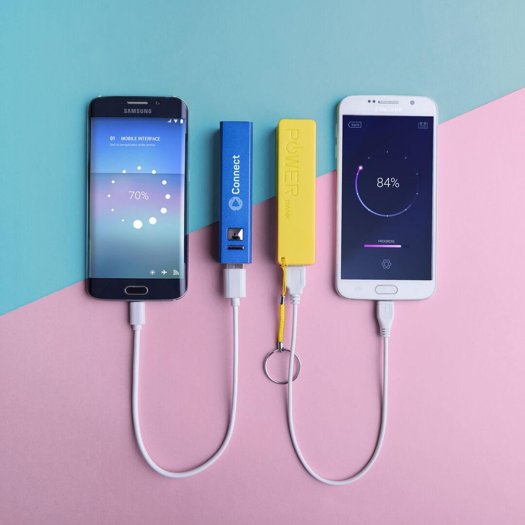 Power bank esterno in alluminio con capacità di carica di 2.200 mAh.