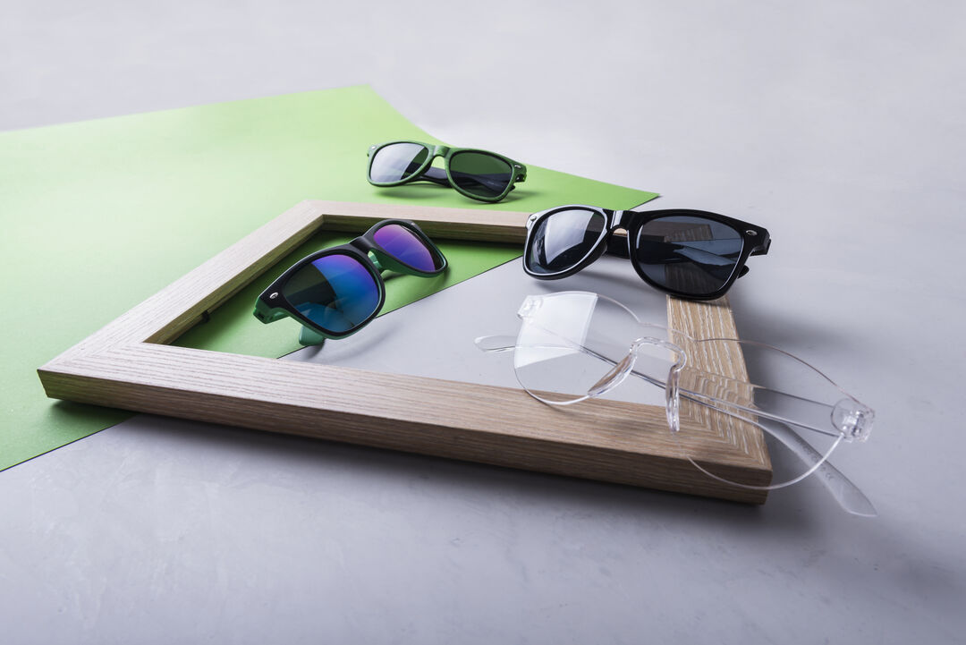 Occhiali da sole di ultima generazione con montatura in legno melange in diversi colori.