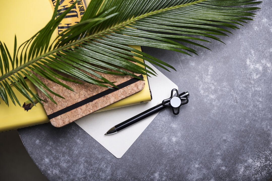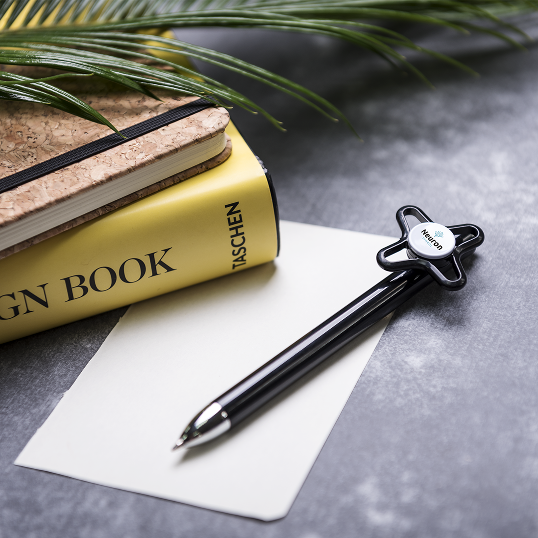 Originale Penna spinner antistress con meccanismo a pulsante e design divertente con accessopri in color argentoe e fusto a tinta unica in colori vivaci.