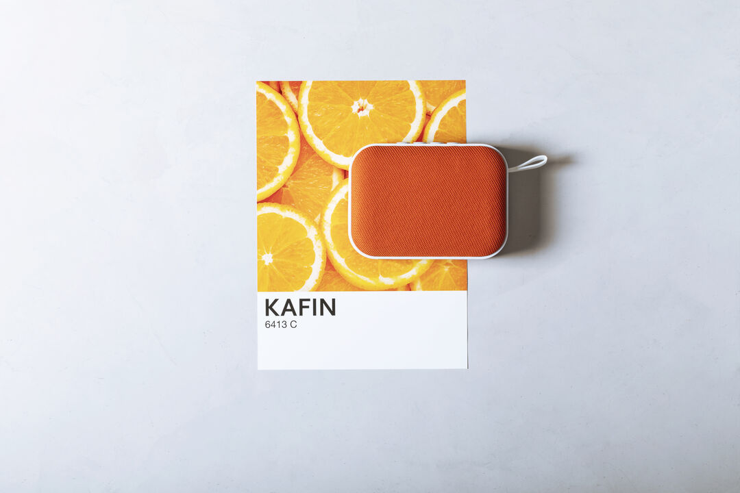 Altoparlante di connessione Bluetooth® 5.0 bicolore, con griglia in poliestere e maniglia di trasporto in silicone coordinata.