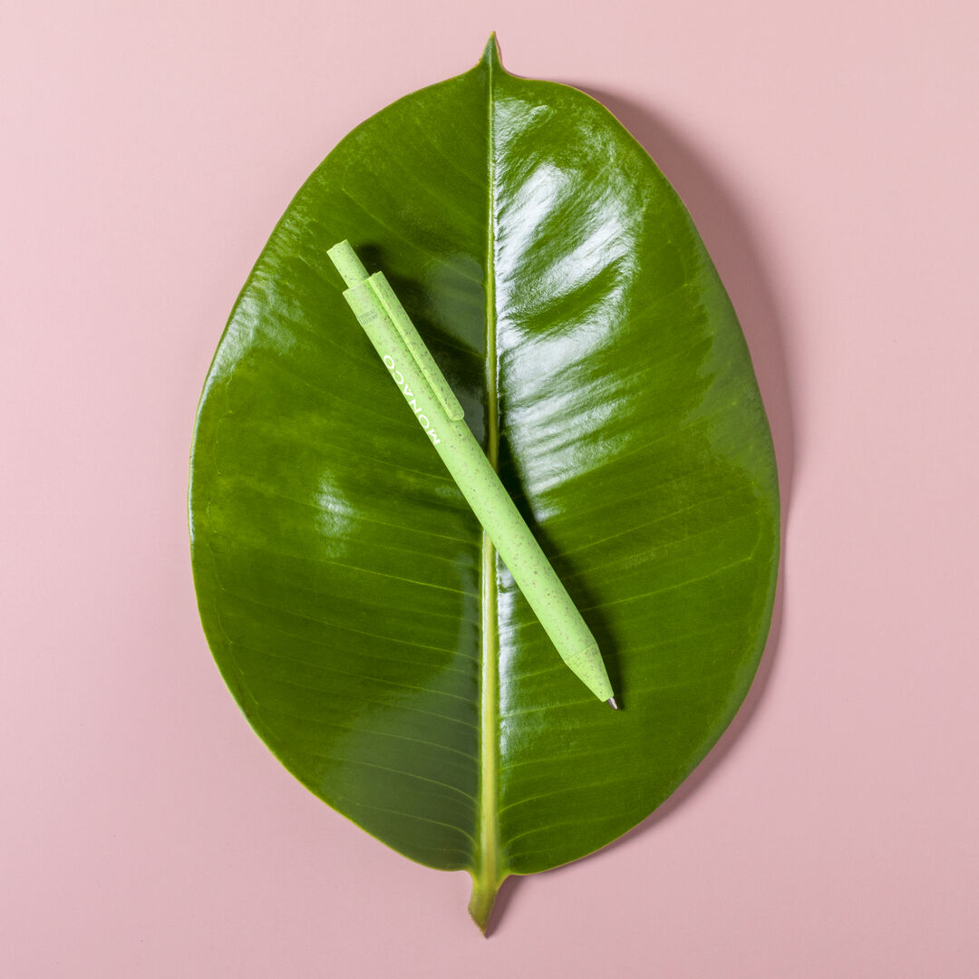 Fusto in fibra di grano e PP, per favorire l'utilizzo di materie prime naturali e ridurre le emissioni inquinanti. Clip con ampia area di stampa, disponibile in un'ampia gamma di colori pastello e refill blu.