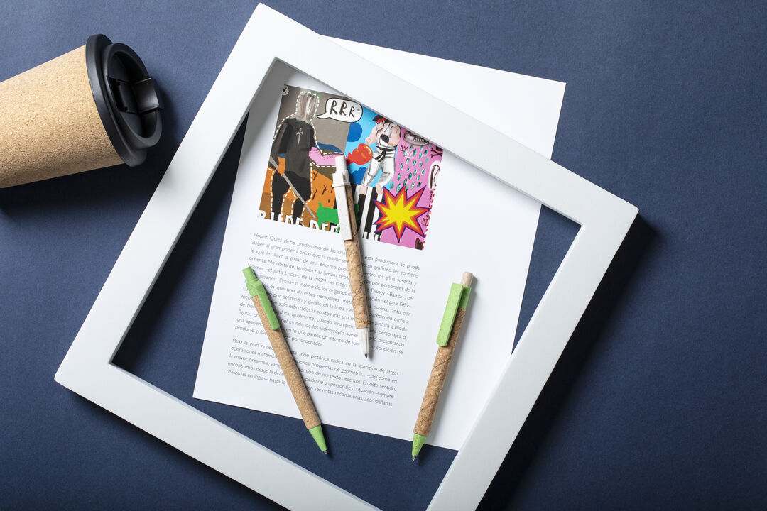 Fusto in sughero naturale e accessori in fibra di grano e ABS , per promuovere l'uso e il riciclaggio delle materie prime, riducendo così le emissioni inquinanti. Disponibile in un'ampia gamma di colori, conrefill blu.
