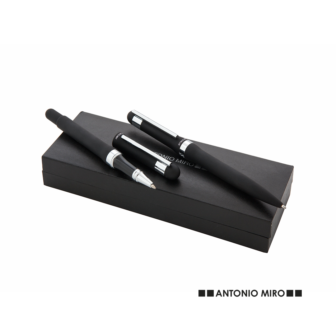 Elegante set by Antonio Miró con penna con meccanismo a rotazione e penna roller con cappuccio e originale anello dal design sobrio.