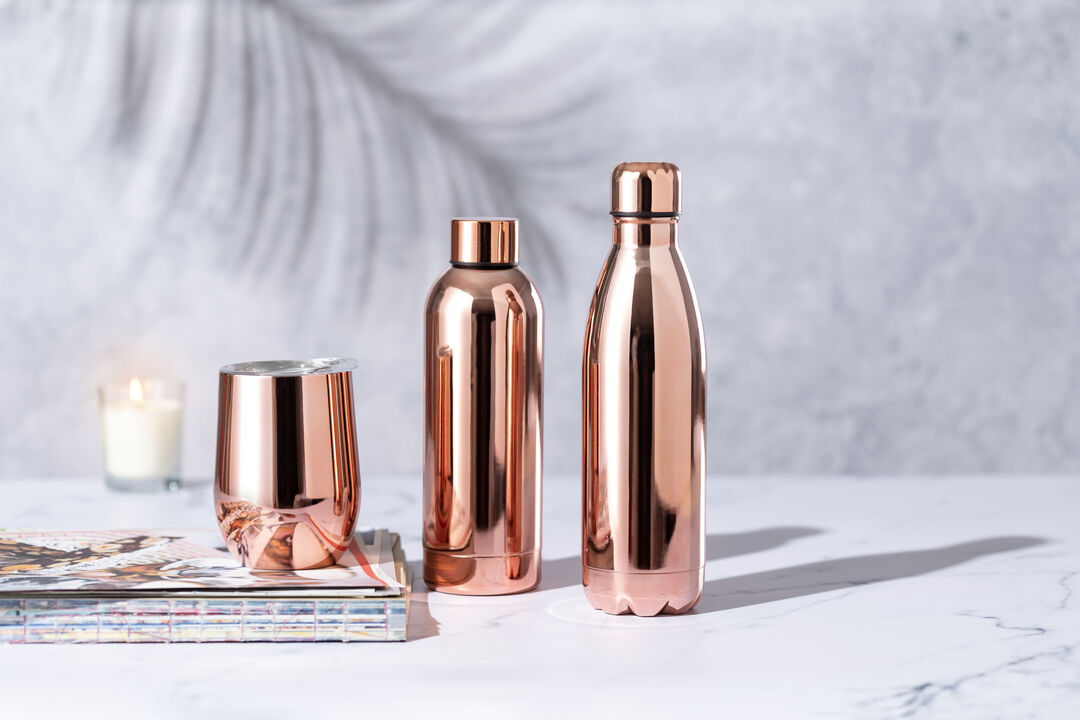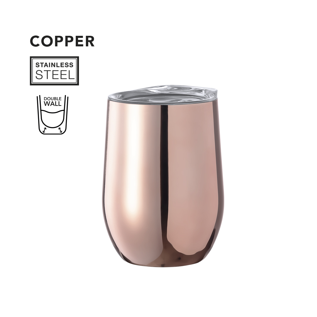Bicchiere termico da tavolo in acciaio inox a doppia parete e capacità di 350 ml, con rivestimento esterno in rame galvanizzato.