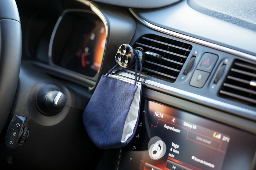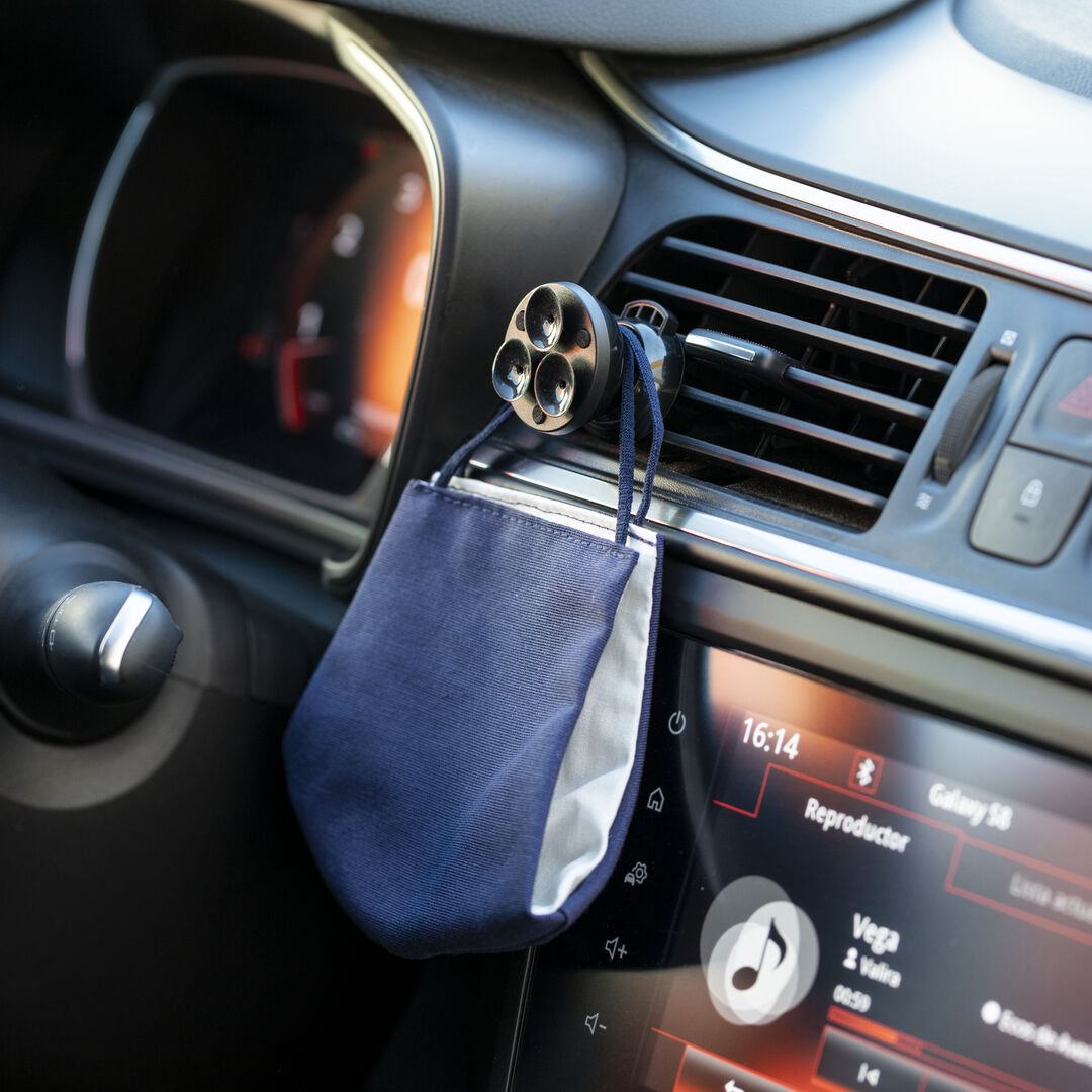 Supporto per griglia auto per smartphone con fissaggio a ventosa al dispositivo.