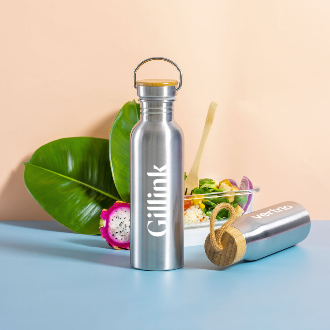 Corpo in acciaio inossidabile e tappo in bambù con maniglia originale in metallo per il trasporto.
