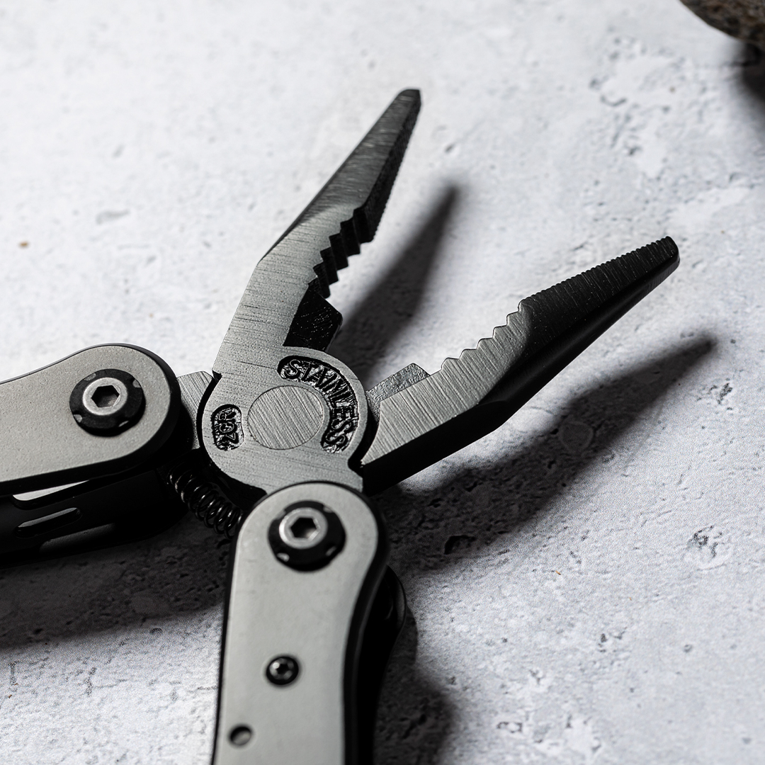 Info: Multiutensile con accessori in acciaio inox nero e robusta impugnatura in alluminio abbinata. Con 13 funzioni, tra cui coltello e rasoio, cacciavite, lima, apriscatole e pinze. Pieghevole e di dimensioni compatte, presentato in una scatola individuale di design nera.