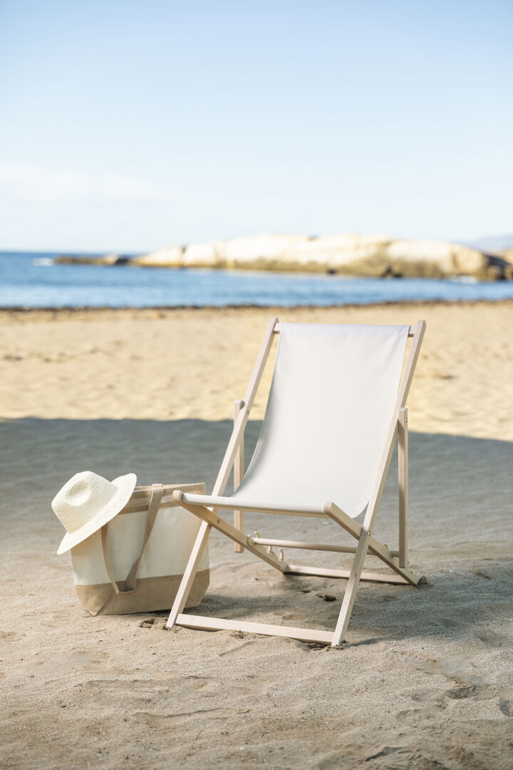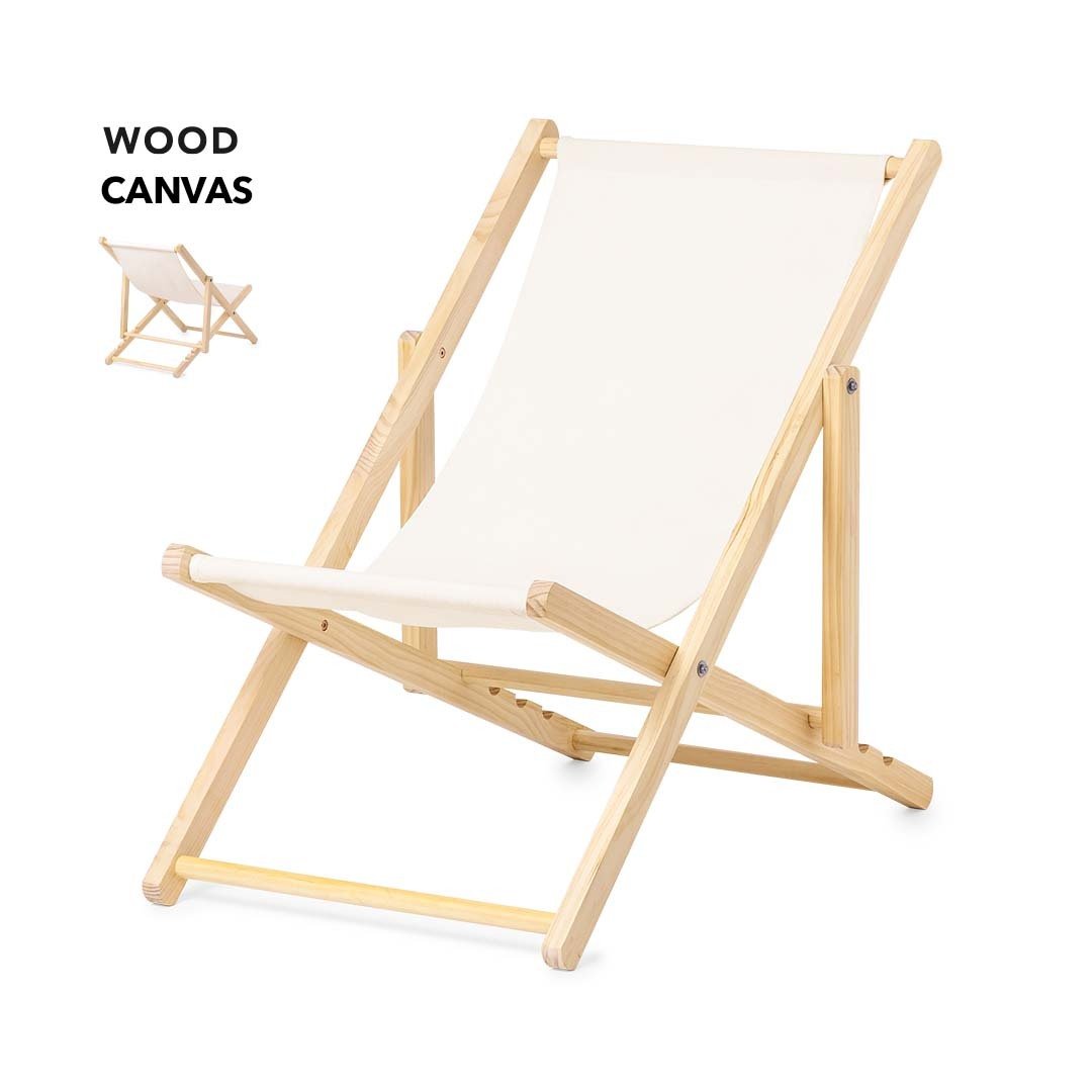 Sedia pieghevole con struttura in legno, schienale e seduta in tela resistente, morbida e pesante, con finitura naturale.