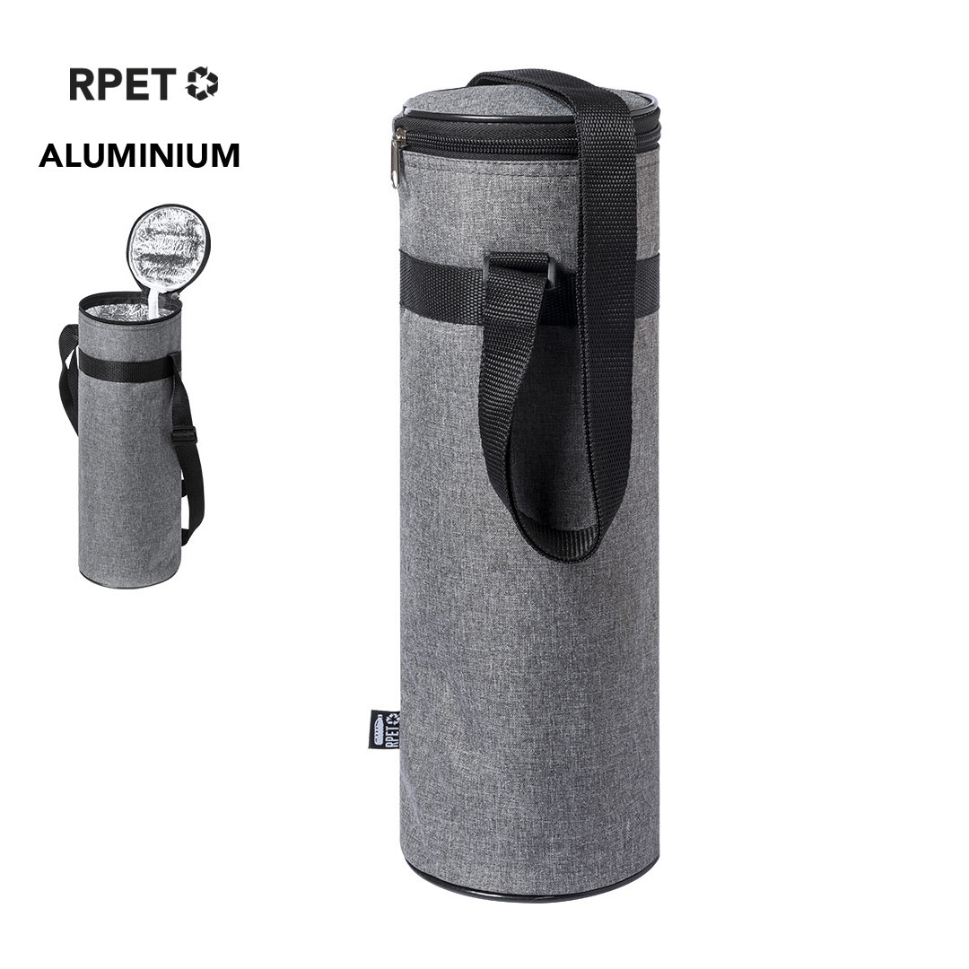 Info: Borsa termica della linea Natura per bottiglie fino a 1,5l, realizzata in resistente poliestere 300D RPET, in plastica riciclata per promuovere il riutilizzo dei rifiuti plastici e contribuire alla sostenibilità del pianeta. Con chiusura a zip e comoda tracolla regolabile. Interno isotermico in alluminio con distintivo RPET sull'etichetta.