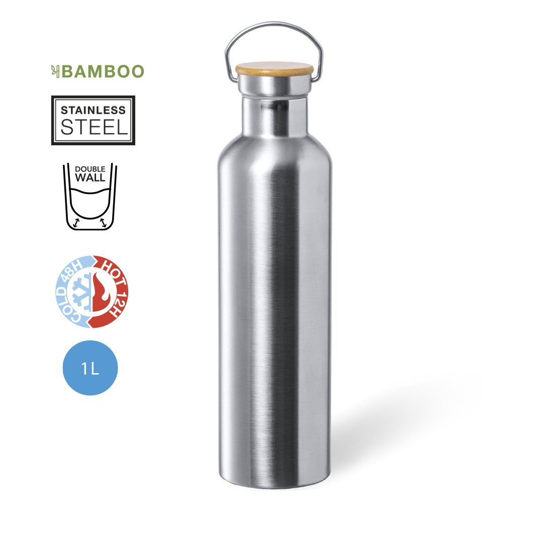 Info: Borraccia termica da 1 litro di capacità, realizzata in acciaio inox a doppia parete con finitura opaca. Include il tappo a vite originale in acciaio inox con dettagli in bambù e manico integrato. Priva di BPA e presentata in una scatola individuale dal design kraft.