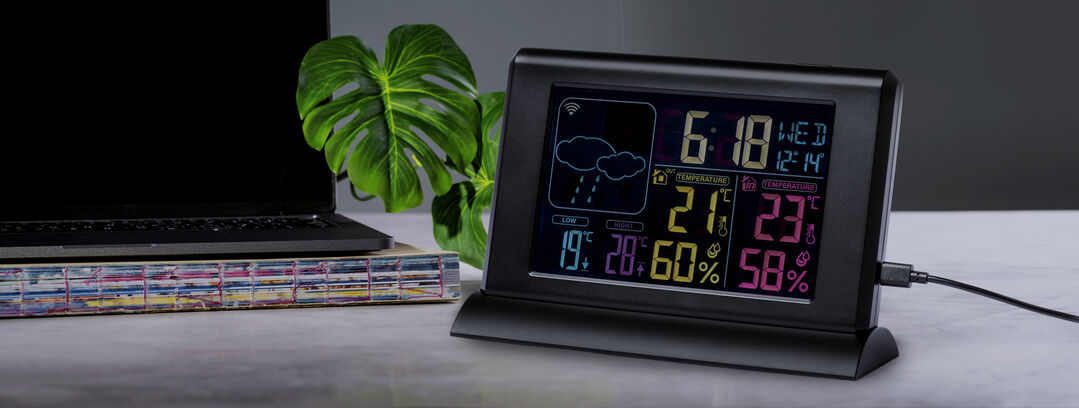Info: Stazione meteorologica multifunzione di qualità superiore, realizzata in ABS resistente con finitura nera satinata. Include un display retroilluminato di facile lettura con grafica a colori. Con sensore wireless di temperatura/umidità esterna e sensore integrato di temperatura/umidità interna. Funzioni di sveglia e calendario, con APP disponibile - compatibile con iOS/ Android - per il controllo remoto tramite rete WiFi e funzioni extra. Adattatore di alimentazione e cavo USB lungo 1 m inclusi, con staffa di montaggio a parete. Sensore esterno con alimentazione a batteria (2xAAA non inclusa). Confezionata singolarmente in una scatola kraft, con manuale di istruzioni in inglese e spagnolo.