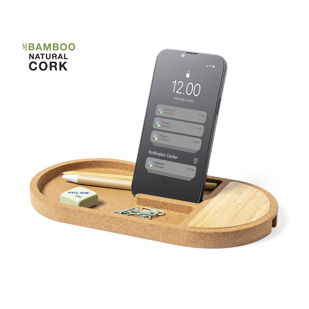 Info: Caricatore organizer wireless da 15W. Con base in sughero naturale e superficie di caricamento in bambù. Porta smartphone integrato e spazio per la cancelleria. Compatibile con i dispositivi dotati di tecnologia di ricarica wireless Qi, con indicatore di stato di ricarica a LED e cavo di ricarica Type-C incluso. Base antiscivolo e presentato in una scatola kraft individuale, con manuale di istruzioni in inglese e spagnolo.Prodotto secondo gli standard RoHS e in conformità ai seguenti requisiti di sicurezza:Sistema di protezione dal surriscaldamento.Sistema di protezione da sovraccarico.Sistema di bloccaggio per evitare cortocircuiti.