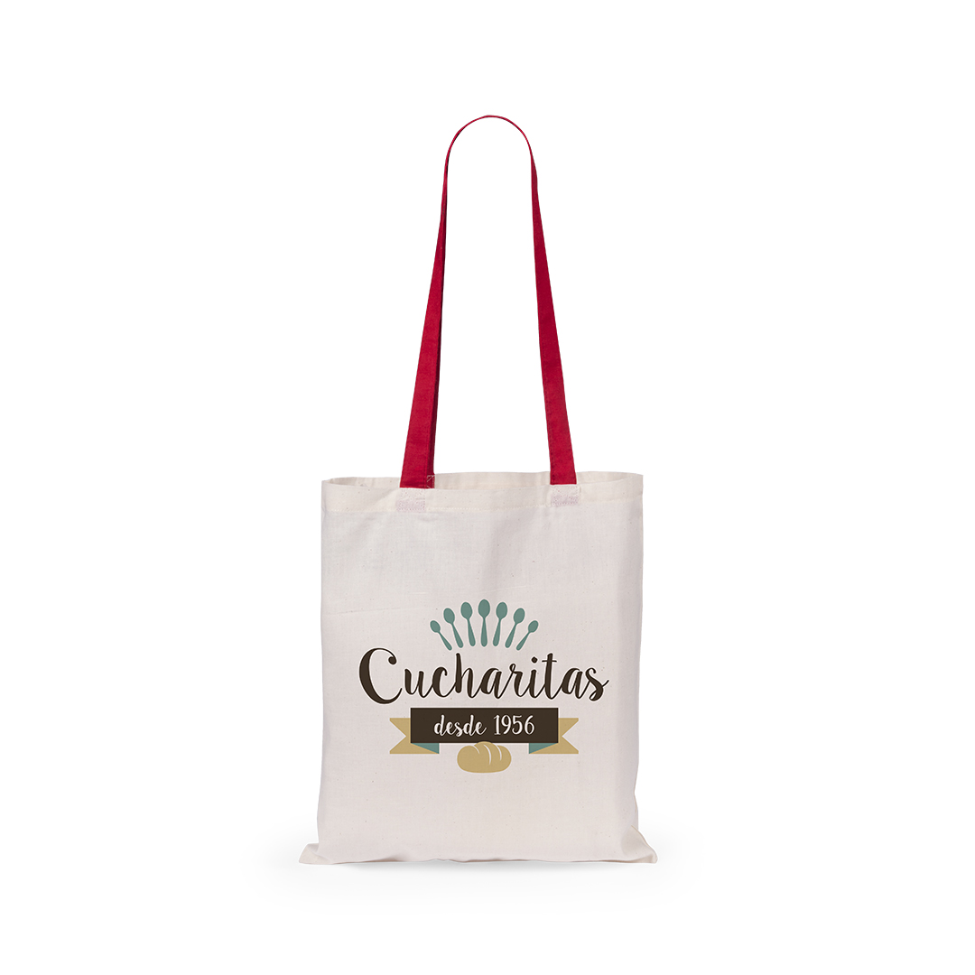 Info: Borsa 100% cotone con una combinazione di corpo in colore naturale e manici in una gamma di colori vivaci. Con manici lunghi 70 cm e finitura cucita. Resistenza fino a 7 kg di peso.