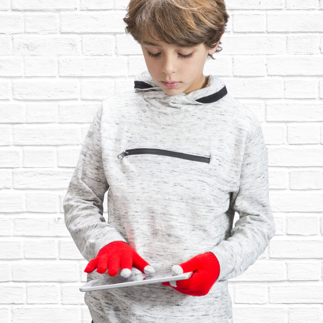 Info: Pratico paio di guanti per bambini per dispositivi touchscreen, con finitura in morbido acrilico e colori divertenti. Con puntatore integrato su medio, indice e pollice. Taglia unica.